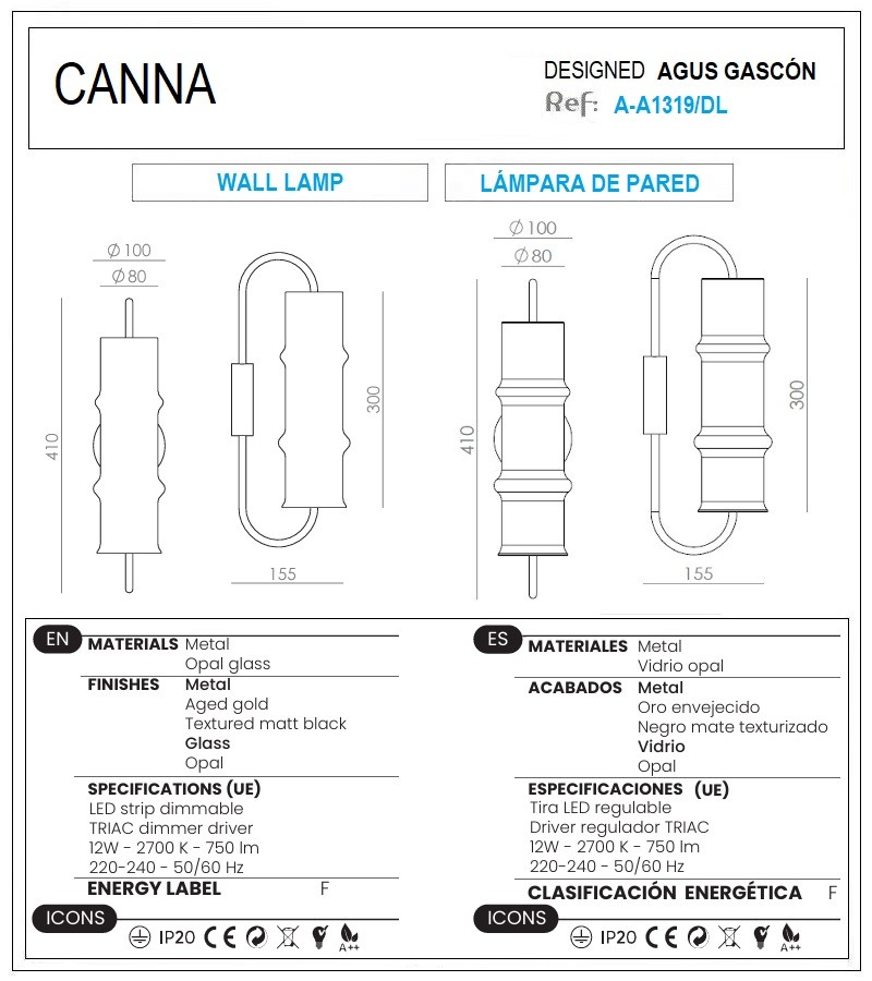 Canna Wall Light by Aromas, designed by Agus Gascón, is crafted from the best opal glass material and boasts a cylindrical shape that exudes timeless beauty to bring a quiet and elegant note to key areas around the home. The Canna Wall Light features an integrated LED strip with a power rating of 12W, collectively producing 750 lumens, providing warm light at 2700K with a Touch Me Dimmer and an ON/OFF control for convenient light adjustment. It operates on 220-240 V/ 24V at 50/60Hz, is rated IP20, for indoor and is classified as Class I for safety.