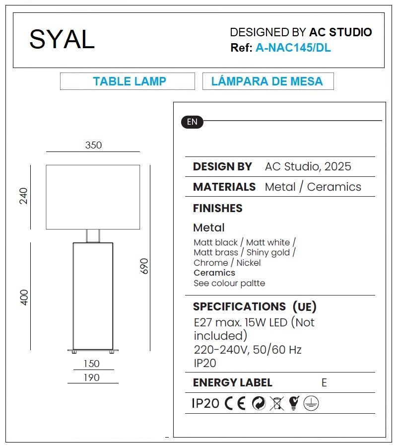 The Syal Table Lamp LED combines elegant design with modern technology, featuring an integrated E27 LED with a power rating of 15W, providing warm light at 2700K The Syal lamp is equipped with an ON/OFF and dimmer integrated technology in the body, allowing you to easily adjust the light brightness level to suit your needs. It operates on 220– 240V at 50/60 Hz, is rated IP20, and classified as Class II for safety.